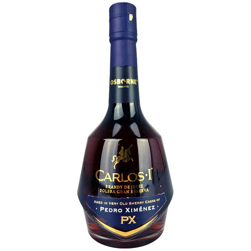 Entdecken Sie den Carlos I Brandy De Jerez Solera Gran Reserva PX, benannt nach dem spanischen König Carlos I (1500-1585). Dieser exklusive Brandy spiegelt die reiche Tradition und das Erbe der Bodega Osborne wider, einem Familienunternehmen, das für seine Brandyherstellung ausschließlich kräftige Grundweine aus der Rebsorte Airen verwendet.