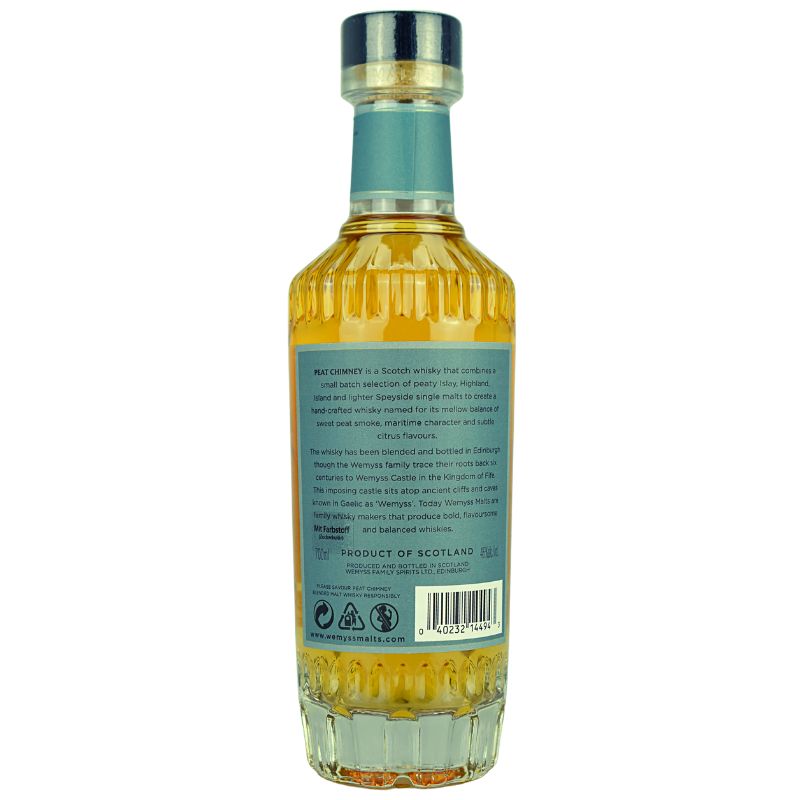 Herstellung: Peat Chimney wird aus einer sorgfältigen Auswahl von Single Malts aus verschiedenen Destillerien Schottlands hergestellt, die für ihren rauchigen Charakter bekannt sind. Die Malts werden aus gemälzter Gerste hergestellt, die über Torffeuer getrocknet wird, was dem Whisky seine charakteristische Rauchigkeit verleiht.